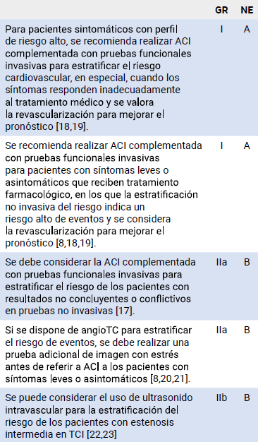 Como primera línea se recomienda el uso de imágenes funcionales no invasivas para detectar isquemia, tipo ecocardiograma de estrés ejercicio o farmacológico (por su amplia disponibilidad en la región, capacitación y costo) y complementar en casos específicos con imágenes anatómicas mediante angioTC, cuando existe necesidad de profundizar o definir con mayor precisión la patología coronaria (1).