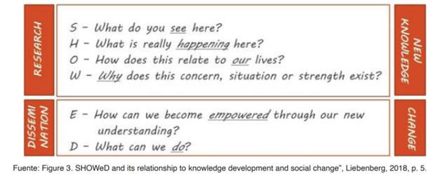 Para este proceso del VOICE (Wang y Burris, 1997, p. 381) o de sesiones grupales, que sería el núcleo de la foto voz como herramienta pedagógica, Wang y Burris diseñaron SHOWeD (ver figura 1). Este es un instrumento para el trabajo grupal con las imágenes captadas por sus participantes.