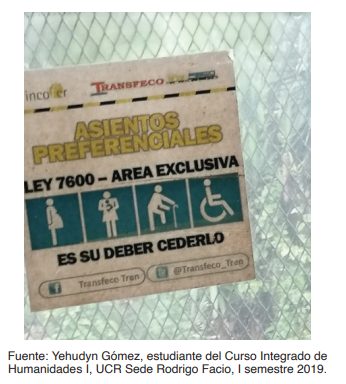 La foto voz también puede llevar a prestar más atención al día a día y cómo se reproducen tanto los modelos sociales de conducta como las imposiciones de género. Este es el caso de Yehudyn, quien fotografió el aviso del tren (ver figura 6), para mostrar la reproducción de roles tradicionales de género, en los que la masculinidad no asume el cuido ni la paternidad. Esto dio pie para comentar estadísticas formales sobre quién lleva la carga del cuido en Costa Rica, y la enorme desigualdad en este aspecto entre mujeres y hombres. También desató emociones respecto a conductas típicas en el transporte público, pues varios de ellos afirmaron haber sido testigos de casos en los que un padre que cargaba a su hijo o hija en un autobús lleno, no había recibido el asiento por parte de ninguno de los otros pasajeros. Nos permitió hablar sobre estudios de uso del tiempo, sus resultados en Costa Rica y el mundo, a la vez que analizamos las enormes desigualdades y cómo estos estereotipos se reproducen cotidianamente frente a nosotros.