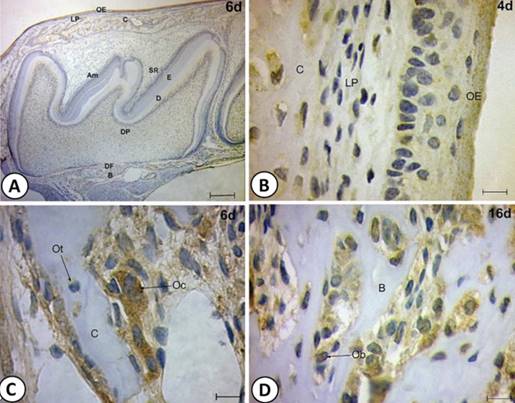 Figure 1 MMP-2 expression in alveolar bone and lamina propria. A: Sagittal section of a tooth germ and surrounding tissues showing oral epithelium (OE), lamina propria (LP), coronal region of bony crypt (coronal bone, C), stellate reticulum (SR), ameloblasts (Am), enamel (E), dentin (D), dental papilla (DP), dental follicle (DF) and basal region of bony crypt (basal bone, B), Scale bar: 100 µm. B: Higher magnification of MMP-2 expression in lamina propria and coronal bone (four-day-old animal). C: Higher magnification of MMP-2 expression in osteocytes (Ot) and osteoclasts (Oc) in coronal bone (six-day-old animal). D: Higher magnification of MMP-2 expression in osteoblasts (Ob) in basal bone (16-day-old). B-C: Scale bar 5 µm.