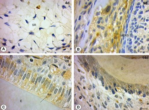 Figure 2 MMP-2 expression in the dental germ. A: Stellate reticulum cells (SR) expressing MMP-2 in four-day-old animals. B: Dental follicle (DF) cells next to Hertwig's epithelial root sheath in nine-day-old animals. C: Ameloblasts (Am) expressing MMP-2 in 11-day-old animals. (E): enamel. D: Odontoblasts (Od) and dental papilla (DP) cells expressing MMP-2 in 14-day-old animals. (D): dentin. Scale bar: 5 µm.