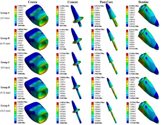 Regarding the distribution of | maximum stresses in teeth rehabilitated post-endodontics with posts of different lengths, the lowest distribution stress in the crown was observed for groups A and C, while the distribution stress in the dentin and cement was homogeneous. In the post, the highest distribution was found in group E (Table 3).