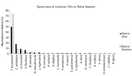 Nueve especies se encontraron en la época seca y no se presentaron en la lluviosa, mientras que seis especies de la lluviosa no se contabilizaron en la seca (Fig. 1).