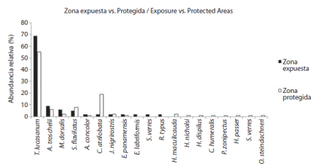 Dos especies se registraron en la zona expuesta y no se contabilizaron en la protegida y siete especies de la protegida no se presentaron en la expuesta (Cuadro 2).