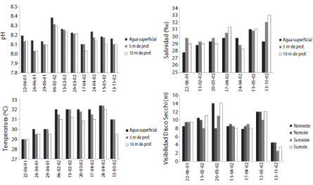 Los datos físicos-químicos evaluados en La Viuda, como el pH y la temperatura presentaron valores inversamente proporcionales a la profundidad, mientras que la salinidad era directamente proporcional. Las medidas de pH están en un rango entre 8.03-8.38, los de temperatura entre 29oC y 32.4oC, la visibilidad del disco Secchi entre 2.5 y 14m y los rangos de salinidad se encuentran entre 27.8-33.0 (Fig. 3).