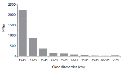 ± 13.9 m2/ha. Seis de las 44 parcelas tuvieron áreas basales superiores a 55 m2/ha, siendo 75.4 m2/ha el mayor valor registrado. Estas parcelas dentro del muestreo aleatorio, fueron establecidas en sitios con aglomeraciones de la especie C. excelsa. El número de árboles por hectárea estuvo entre 368.8 ± 127.6 N/ha y tuvo relación significativa con el área basal (n= 42, F = 16.6, r2= 26.7, p= 0.0002). Respecto a la distribución diamétrica, se observó que ésta presenta forma de J invertida, la cual es típica de comunidades maduras y disetáneas (Figura 1).