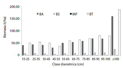 Mg/ha (Cuadro 3). Los robledales del sur del Huila almacenan en promedio un total de 272.9 ± 42.0 MgC/ha, de los cuales 72.5 % se encuentran almacenadas en la biomasa aérea, 13.6 % en la biomasa subterránea de raíces, y 13.9 % en la necromasa. En relación con la distribución de la biomasa aérea por clase diamétrica, se observó que ésta se encuentra concentrada principalmente en los árboles con diámetros grandes (e.g. 95 - 105 cm y ≥ 105 cm; Figura 2).