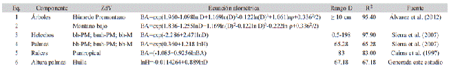 Cuadro 1: Ecuaciones empleadas para las estimaciones de altura, biomasa aérea y raíces en los bosques del sur de los Andes Colombianos. Table 1: Equations used by high, aboveground biomass and belowground in the forests located in the South of the Colombian Andean