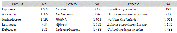 Riqueza y composición florística: Se registraron en total 12 180 individuos en 11 ha inventariadas, representados 46 familias, 95 géneros y 68 especies. Del total de los individuos, 50.5 % fueron clasificados al nivel de especie, 20.2 % al nivel de género, 0.01 % al nivel de familia, y 29.3 % quedaron como indeterminadas. En general las especies con mayor abundancia fueron C. excelsa (5 952 N/ ha), Alfaroa colombiana Lozano, Hern. Cam. & Espinal (4 768 N/ha), Quercus humboldtii (356 N/ha) y Billia rosea Planch. & Linden C. Ulloa & P. Jørg. (752 N/ha), las cuales presentaron además, altos valores de densidad de la madera (0.7-0.8 g/cm3). Del total de los individuos registrados, 10.8 % fueron palmas, 1.4 % helechos arbóreos y el 87.8 % restante, fueron especies arbóreas leñosas. En el Cuadro 2 se presenta el listado de las familias, géneros y especies más importantes en estos bosques, teniendo en cuenta la abundancia de las mismas en el ecosistema.