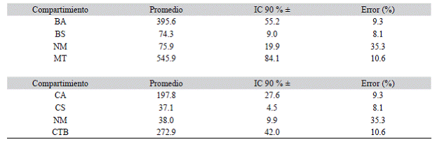 La biomasa aérea promedio del bosque fue 395.6 ± 55.2 Mg/ha, la cual es explicada en 99.4 % por el componente arbóreo leñoso, 0.3 % por las palmas y 0.3 % por los helechos arbóreos. Por su parte, la biomasa subterránea fue del orden de 74.3 ± 9.0 Mg/ha y la necromasa de 75.9 ± 19.9 Mg/ha. De esta, el 53.1 % fue aportado por los detritos gruesos caídos (DGC), y el 46.9 % por los árboles muertos en pie (AMP). La masa total del bosque (MT), compuesta por la biomasa área (BA), la biomasa subterránea (BS) y la necromasa (NM) fue de 545.9 ± 84.1