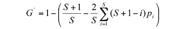 Species evenness: Species evenness at the gap edge was calculated by means of the GINI evenness index (G’) (eq. 5) (Rousseau & Van Hecke, 1999):