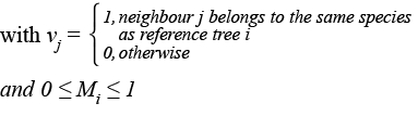Species mingling:Species mingling at the gap edge and neighbourhood (M i ) was defined as the proportion of trees of different species among the four neighbours of the reference tree (Gadow et al., 2012) (eq. 7):
