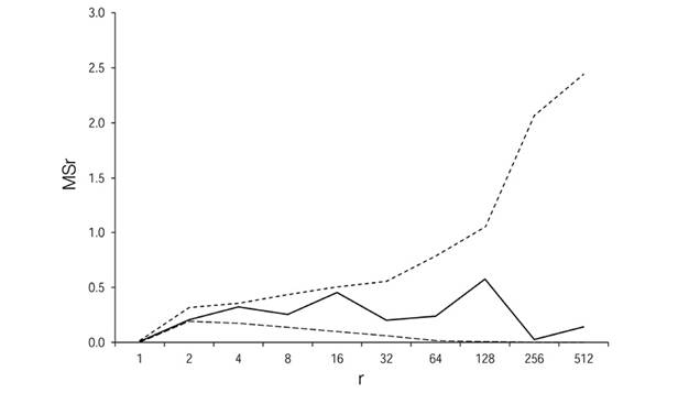 Figure 3 Patterns of gap distribution established using the agglomerative approach method. Mean square MSr (solid line) versus block size r, together with 95% simulation envelopes (dashed lines) for the gaps in one-hectare sample plot. Ávila Viejo community, Canton Loreto.