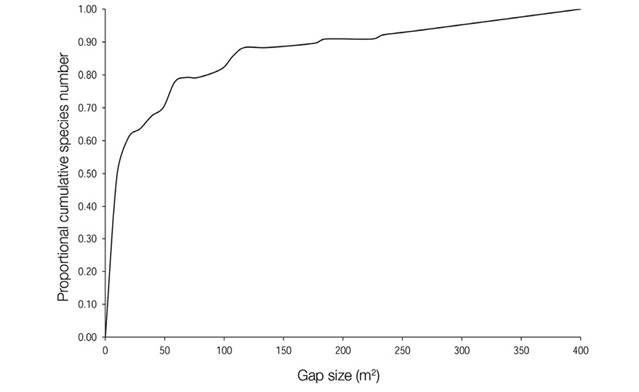Wherep i equals the probability of occurrence of the ith species, and G’= 1 for perfect evenness (p 1 =p 2 …=p s ). The relationship between the gap size and species richness at the gap edge was determined by using a species-gap size curve. The species richness was quantified using the number of species (S) per each gap.