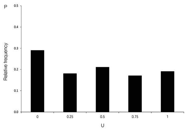 The distribution of size differentiation at the gap edge (U) (Figure 6) was skewed to the left, showing that 35 % of the reference trees were dominant in their immediate vicinity, while most trees (65 %), were surrounded by at least three larger neighbours.