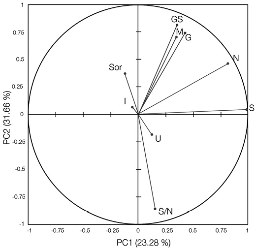 Principal Component Analysis (PCA):The variables tree number at the gap edge (N), number of tree species at the gap edges (S), number of tree species per stem at the gap edge (S/N), species similarity at the gap edge (Sør), gap size (GS), species evenness at the gap edge (G´), size differentiation at the gap edge (U), gap isolation (I), and species mingling at the gap edge (M), were analysed to detect any relationships between variables using Principal Component Analysis with varimax rotation, and the Spearman correlation index (r s ), by using XLSTAT 2015.1.02 for Windows. The Bartlett test was applied to test the significance of eigenvalues.