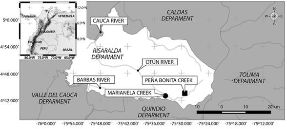 Figure 1 Experimental sites in the Otún River watershed, Colombia. The insets show the location of the department of Risaralda, the Otún River watershed and the Peña Bonita and Marianela streams.
