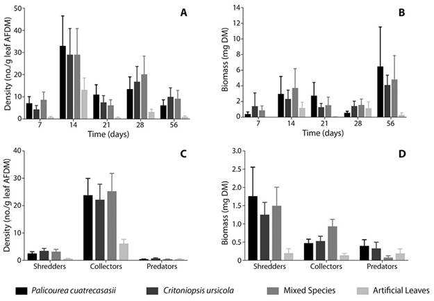 On the other hand, there was no significant difference in macroinvertebrate density between streams (two-way RM ANOVA, F1,12 = 0.36, P = 0.576) and natural leaves had a higher macroinvertebrate density than artificial leaves (P < 0.05; Figure 3A). Macroinvertebrate density peaked at day 14, and then returned to the levels of day 7 for the rest of the experiments, with no significant differences between natural leaves (P > 0.05; Figure 3A). Furthermore, collectors had the highest density (mean = 19.3 no./g leaf AFDM), followed by very low densities of shredders (mean = 2.5 no./g leaf AFDM) and predators (mean = 0.4 no./g leaf AFDM) (Friedman rank sum test, P < 0.05; Figure 3C). The family Chironomidae (Diptera) had the highest relative density (74.4 %), followed by a very low density of Phylloicus (Trichoptera; 7.8 %). Macroinvertebrate biomass was not significantly different between streams (two-way RM ANOVA, F1,12 = 2.56, P = 0.185) or leaf species (two-way RM ANOVA, F3,12 = 2.88, P = 0.079). Although the statistical analysis did not detect differences between natural and artificial leaves, there was a trend for lower macroinvertebrate biomass in artificial leaves (mean = 0.53 mg DM) (Figure 3B). Macroinvertebrate biomass was the highest after 56 days in all leaf species; however, there was no clear pattern of steady increase in biomass through time (Figure 3B). Additionally, there was a significant difference in biomass between FFGs (one-way RM ANOVA, F2,8 = 6.132, P = 0.024), with shredders presenting higher biomass (mean = 1.17 mg DM) than collectors (mean = 0.51 mg DM) and predators (mean = 0.24 mg DM) (P < 0.05; Figure 3D). The genera Anchytarsus (Coleoptera: Ptilodactilydae) and Phylloicus (both classified as shredders) were the taxa with the highest relative biomass (both taxa had 52.2 % of relative biomass), followed by Chironomidae and the genus Heterelmis (Coleoptera) (both classified as collectors), which had 17.6 % of relative biomass. Although shredders had the highest biomass (Figure 3D), no significant relationship was observed between macroinvertebrate biomass and leaf mass loss in any leaf species (correlation coefficients: C. ursicola = -0.0668, P. cuatrecasasii = -0.273, mixed-species = -0.0934; P > 0.05).