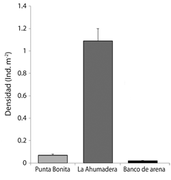 A lo largo del estudio, se determinaron valores de densidad significativamente similares entre Punta Bonita y Banco de Arena, pero en el sector La Ahumadera, se obtuvieron mayores densidades, tendencia que se presentó durante todo el estudio, hecho que se le puede atribuir a la presencia de parches consolidados de Thalassia testudinum, lo cual concuerda con los resultados obtenidos por Conde, Sembrano & Diaz (1995) y Tagliafico, Rangel & Rago (2011), quienes encontraron que las especies I. badionotus y H. mexicana, presentaron mayores densidades en zonas donde el sustrato predominante está compuesto por este tipo de pastos marinos en dos localidades de Venezuela. Varios autores han demostrado que la presencia de una alta cobertura de pastos marinos y macroalgas, puede repercutir positivamente en la abundancia de individuos y en la riqueza específica (Alcolado et al., 1998; Valle-García et al., 2008), al generar espacio y alimento, servir de sustrato de fijación y refugio a otros organismos, y estabilizar los sedimentos (Fitzhardinge, 1983). Asimismo, la ubicación geográfica de La Ahumadera puede ser un factor que favorece la abundancia deorganismos en dicho sector; al ser una zona protegida, en contraste con Punta Bonita y Banco de Arena, se puede permitir el establecimiento de larvas que son transportadas por las corrientes oceanográficas debido a que presentan elevada capacidad de dispersión a través de su rango geográfico (Féral, 2002).