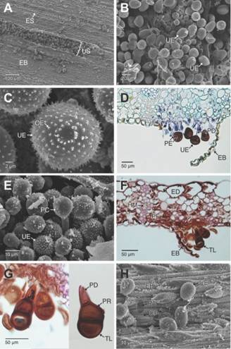 Fig. 2. Fig. 2 Estados espóricos dePuccinia nakanishikii en Cymbopogon citratus. A-B. Urediosoros sobre la cara abaxial de la hoja. Se aprecian las masas de urediosporas. C. Detalle de las urediosporas. D. Sección transversal de un urediosoro. Se aprecian las urediosporas con poros germinativos ecuatoriales (campo claro, azul de Alcian-Hematoxilina.). E. Paráfisis capitada en los urediosoros. F-G. Secciones trasversales de un teliosoro y detalles de las teliosporas. Se aprecia el poro germinativo lateral de las teliosporas (campo claro, Safranina-azul de Alcian). H. Parche de adhesión de las urediosporas en la epidermis abaxial. Se observa la degradación de las ceras epicuticulares.CP: ceras epicuticulares; EB: epidermis abaxial; ED: epidermis adaxial; ES: estomas; HM: haces vasculares de menor diámetro; OE: ornamentación equinulada; PA: parche de adhesión; PC: paráfisis capitadas; PD: pedicelo; PE: poros germinativos ecuatoriales; PF: parénquima fotosintético; PR: poro de germinación; TL: teliospora; UE: urediosporas; US: urediosoro. Sporal stages of Puccinia nakanishikii in Cymbopogon citratus. A-B. Uredosori over the abaxial face of the leaf blade. Masses of urediniospores are visible. C. Detail of the urediniospores. D. Cross section of the uredosorus. The urediniospores bearing equatorial germinative pores can be noticed (bright field, Alcian blue-Hematoxylin.). E. Capitate paraphysis on the uredosorus. F-G. Cross section of a teliosorus and details of the teliospores. The equatorial germ pores are visible on the teliospores (bright field, Safranin-Alcian blue). H. Adhesion patch of the urediniospores on the abaxial epidermis. Degradation of the epicuticular waxes is visible.CP: epicuticular waxes; EB: abaxial epidermis; ED: adaxial epidermis; ES: stomata; HM: short diameter vascular bundles; OE: echinulate ornamentation; PA: adhesion patch; PC: capitate paraphyses; PD: pedicel; PE: equatorial germ pores; PF: photosynthetic parenchyma; PR: germ pores; TL: teliospore; UE: urediniospores; US: uredosori