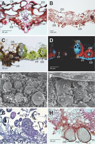 Fig. 5 Fig. 5 Aspectos histopatológicos en las hojas de Cymbopogon citratus afectadas por Puccinia nakanishikii y picnidios con picnidiosporas del hiperparásito Sphaerellopsis. A-B. Secciones trasversales de las hojas necróticas. Con la evolución de la necrosis celular, todos los tejidos de la lámina foliar colapsan, persistiendo los haces vasculares colaterales de mayor diámetro (campo claro y con Safranina-azul de Alcian). C-B. Secciones transversales a mano alzada de un urediosoro (campo claro, sin teñir y epifluorescencia con luz UV, respectivamente). C. Los tejidos necróticos se aprecian en color marrón oscuro y los sanos en color verde. D. Los tejidos fotosintéticos sanos emiten autofluorescencia en rojo; los tejidos necrosados no presentan esta emisión. E-F. Detalle de los picnidios y picnidiosporas libres de Sphaerellopsis. G-H. Secciones longitudinales de los picnidios. G. Se aprecian las picnidiosporas (campo claro, azul de Toluidina). H. Se aprecia la estrecha unión entre los picnidios y los tejidos afectados por la roya (campo claro, Safranina azul de Alcian).CB: células buliformes; EB: epidermis abaxial; ED: epidermis adaxial; ES: estomas; FL: floema; HD: haces vasculares de mayor diámetro; HM: haces vasculares de menor diámetro; OS: ostiolo; PC: paráfisis capitadas; PF: parénquima fotosintético; PI: picnidios; PIE: picnidiosporas libres; PX: protoxilema; UE: urediospora; US: urediosoro. Histopathological aspects of the leaves from Cymbopogon citratus affected by Puccinia nakanishikii and pycnidia with pycnidiospores of the hyperparasite Sphaerellopsis. A-B. Cross sections of the necrotic leaves. As the cell necrosis progresses, all the tissues in the leaf blade collapse, the collateral vascular bundles of longer diameter persist. (bright field and Safranin-Alcian blue). C-B. Freehand cross-sections of a uredosorus (bright field, unstained and epifluorescence with UV light respectively). C. Necrotic tissues are dark brown and healthy ones, green stained. D. The healthy photosynthetic tissues emit red autofluorescence, while the necrotic ones do not. E-F. Detail of the pycnidia and free pycnidiospores of Sphaerellopsis. G-H. Cross sections of the pycnidia G. Visible pycnidiospores (bright field, Toluidine blue). H. The close junction between the pycnidia and the tissues damaged by the rust can be observed (bright field, Safranin-Alcian blue).CB: bulliform cells; EB: abaxial epidermis; ED: adaxial epidermis; ES: stomata; FL: phloem; HD: short diameter vascular bundles; OS: ostiole; PC: capitate paraphysis; PF: photosynthetic parenchyma; PI: pycnidia; PIE: free pycnidiospores; PX: protoxylem; UE: urediniospore; US: uredosori.