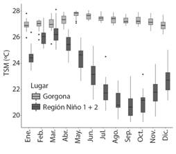 Fig. 1 Fig. 1 Variación mensual de la temperatura superficial del mar (TSM) de isla Gorgona, Pacífico Colombiano, y la región Niño 1+2, Ecuador-Norte Perú. Promedios mensuales del periodo 1981-2010. Monthly variation of sea surface temperature (SST) of Gorgona Island, Colombian Pacific and the Niño 1+2 region, Ecuador-North Peru. Monthly means of the 1981-2010 period.