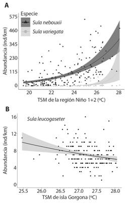 Se analizaron las tendencias mensuales de la abundancia de Sula leucogaster, Sula nebouxii y Sula variegata en relación a la variación de la TSM en el área de influencia de Gorgona, la región de San José en la costa del Perú y la región Niño 1+2.