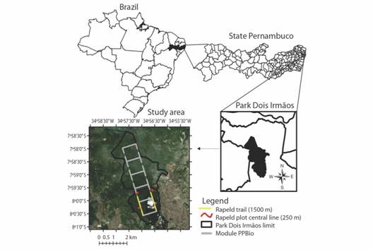 Study area: The study was carried out in a remnant of Atlantic Forest (lowland dense moist forest), located at the Dois Irmãos State Park, a protected area in the State of Pernambuco, Northeast Brazil (7°57’40”-8°00’52” S & 34°56’23”-34°57’31” W), within a periurban matrix and under the negative impacts of matrix changes over the last years. The forest covers 1 158 ha, of which 384 ha are mature forest, and 774 ha are young regenerating forest. Climate is coastal tropical wet and hot, classified as As’ in the Köppen-Geiger system. Mean annual precipitation amounts to 2 417 mm with a maximum in autumn-winter, whereas mean monthly temperatures are always above 23 ºC (Data available from the Instituto Nacional de Meteorologia repository: www.inmet.gov.br). Predominant soil types are Latosol, Argisol and Quartzarenic Neosols, following the Brazilian Soil Database (Benedetti, Curi, Sparovek, Carvalho Filho, & Silva, 2011).