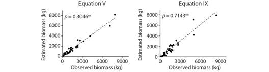 Differently from the others, equations V and IX overestimated AGB in only 2.8 % and, along with other parameters of analysis (R2 adj and Syx %), had the best overall performance. Logarithmic equations I and III underestimated AGB in 18.9 and 10.8 %, respectively, whereas equation II overestimated the biomass in 10.8 %. Linear equations IV, VI and VII overestimated AGB by more than 16 %, which indicated heteroscedastic behavior. Observed biomass values from DFTs and estimated values by equations V and IX were not significantly different (t-test, P> 0.05, Fig. 2).