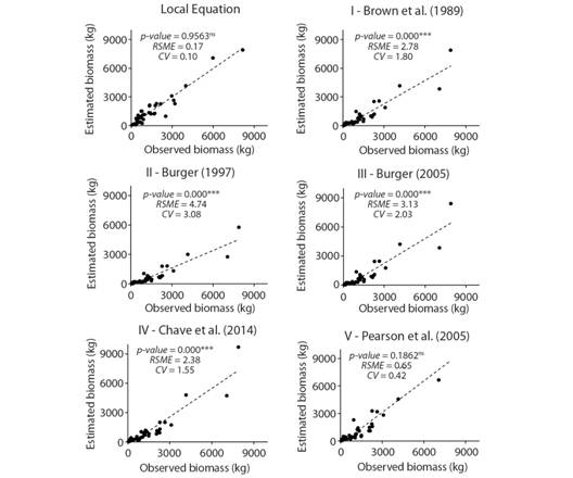 Performance of local equation versus available equations for estimating tree AGB: The observed biomass for the 37 sampled DFTs summed 56.87 Mg. Only two equations estimated values that were not significantly different from observed values (P > 0.05): local and Pearson et al., (2005) equations (Fig. 3). Local equation estimated 55.84 Mg, while Pearson et al. (2005) equation estimated 52.89 Mg. However, the local equation exhibited the lowest RSME and CV. Using available equations, we observed an underestimation of tree biomass in all, including the Pearson et al., (2005), which underestimated the biomass of individuals with smaller diameters (5 to 25 cm) (Digital Appendix 3).