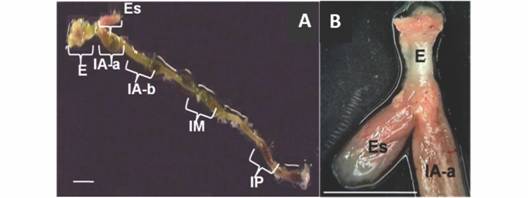 Fig. 1 Fig. 1 Tracto digestivo de P. scalare A. Tracto digestivo: Esófago (E), Estómago (Es), Intestino anterior parte a (IA-a), Intestino anterior parte b (IA-b), Intestino Medio (IM), Intestino Posterior (IP). Barra = 1cm. B. Detalle de Esófago(E), Estómago (Es) e Intestino anterior parte a (IA-a). Barra = 1cm. P. scalare intestinal tract A. Intestinal tract: Esophagus (E), Stomach (Es), Anterior intestine region a (IA-a), Anterior intestine, part b (IA-b), Middle intestine (IM), Posterior intestine (IP). Bar = 1cm. B. Esophagus (E), Stomach (Es) and Anterior intestine part a (IA-a) details. Bar = 1cm.