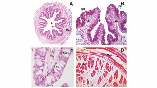 Estudio histológico. Esófago: un órgano corto y elástico compuesto por la mucosa (M), submucosa (S) y muscular (Mus), la serosa (Se) no fue posible identificarla en esta región (Fig. 2A). El epitelio de la mucosa se deforma debido a la gran cantidad de células caliciformes (CC) (90-100 %) presentes dentro de este, observándose gránulos de mucina (Fig. 2B). La capa de mucosa del esófago está compuesta por un epitelio plano estratificado (Epe), de 4 a 5 células de grosor (Fig. 2C). La submucosa está compuesta por tejido conectivo laxo (Fig. 2C) el cual rodea paquetes de músculo estriado longitudinal. Externamente, se encuentra la capa muscular de músculo estriado circular el cual presenta un mayor espesor que el longitudinal (Fig. 2D).