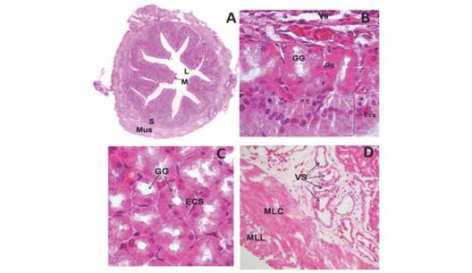 Fig. 3 Fig. 3 A. Vista panorámica del estómago. H&E. 1020X. B. Detalle de la mucosa del estómago H&E. 1020X. C. Detalle de las glándulas gástricas en la mucosa del estómago H&E. 1020X. D. Tejido conectivo laxo de la submucosa y capa muscular del estómago. H&E. 320X. Lumen (L), Mucosa (M), Submucosa (S), Muscular (Mus), Epitelio cilíndrico simple (Ecs), glándulas gástricas (Gg), Vaso sanguíneo (VS), Músculo liso circular (MLC), Músculo liso longitudinal (MLL). A. Stomach panoramic view. H&E. 1020X. B. Detail of stomach mucosa. H&E. 1020X. C. Gastric glands in stomach mucosa. H&E. 1020X. D. Submucosa loose connective tissue and stomach muscular layer. H&E. 320X. Lumen (L), Mucosa (M), Submucosa (S), Muscular (Mus), Simple cubic epithelium (Ecs), Gastric glands (Gg), Blood vessel (VS), Circular smooth muscle (MLC), longitudinal smooth muscle (MLL).