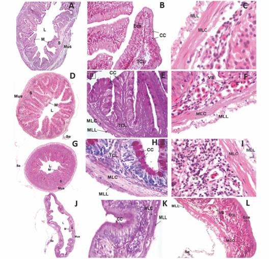 Fig. 4 Fig. 4 A. Vista panorámica del intestino anterior parte a. P.A.S. 80X. B. Pliegues del intestino anterior parte “a”. H&E. 320X. C. Detalle de la capa muscular del intestino anterior parte “a”. H&E. 1020X. D. Vista panorámica del intestino anterior parte “b”. H&E. 80X. E. Detalle del intestino anterior parte “b” y células caliciformes. P.A.S. 520X. F. Detalle de la submucosa y capa muscular del intestino anterior parte “b”. H&E. 1020X. G. Vista panorámica del intestino medio. P.A.S. 80X. H. Detalle de células caliciformes. P.A.S. 1020X. I. Detalle de la submucosa del intestino medio. H&E. 800X. J. Vista panorámica del intestino posterior. P.A.S. 40X. K. Pliegue del intestino posterior. P.A.S. 320X. L. Pliegue del intestino posterior. H&E. 320X. Lumen (L), Mucosa (M), Submucosa (S), Muscular (Mus), Serosa (Se), Epitelio cilíndrico simple (Ecs), células caliciformes P.A.S.+ (CC), tejido conectivo laxo (TCL), Músculo liso circular (MLC), Músculo liso longitudinal (MLL), Vasos sanguíneo (VS). A. Panoramic view of anterior intestine part a PAS. 80X. B. Anterior intestine part a folds. H&E. 320X. C. Detail of anterior intestine part “a”, muscular layer. H&E. 1020X. D. Panoramic view of anterior intestine part b. H&E. 80X. E. Detail of the foregut part “b” and goblet cells. PAS. 520X. F. Detail of submucosa and muscular layer of anterior intestine part “b”. H&E. 1020X. G. Panoramic view of middle intestine. P.A.S. 80X. H. Detail of P.A.S. positive goblet cells. P.A.S. 1020X. I. Detail of middle intestine submucosa. H&E. 800X. J. Panoramic view of posterior intestine. P.A.S. 40X. K. Posterior intestine folds. P.A.S. 320X. L. Posterior intestine fold. H&E. 320X. Lumen (L), Mucosa (M), Submucosa (S), Muscular (Mus), Serosa (Se), Simple cylindrical epithelium (Ecs). P.A.S. + goblet cells (CC), Loose connective tissue (TCL), Circular smooth muscle (MLC), Longitudinal smooth muscle (MLL), Blood vessel (VS).