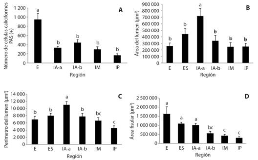 Área del lumen: La región anterior parte “a” del intestino presentó la mayor área del lumen (Fig. 5B) exhibiendo diferencias significativas con el resto de las regiones (P < 0.05). De igual manera las otras regiones no presentaron diferencias significativas entre ellas.