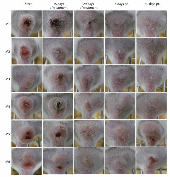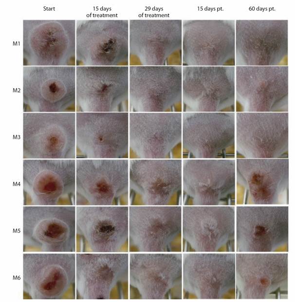 Fig. 2 L. (V.) braziliensis -infected mice response to IL-SbV-150 mg/kg/day x 29. Photographs of CL lesions in mice M1-M6 at the beginning, 15 days and at the end of treatment (29 days); and at 15 and 60 days pt.