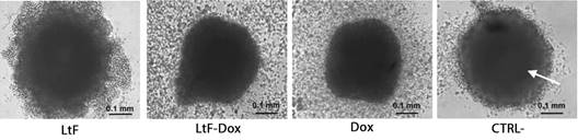 Fig. 1 Morphology of MTSs. Arrow points to central necrotic zone. Abundant cellular debris and peripheral deformation is observed in MTSs treated with LtF, LtF+Dox and Dox. Cell debris was reduced in the CTRL- ×100. IC50 was used for all treatments (N = 4).