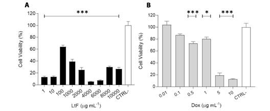 Fig. 2 Antitumor activity of LtF on MTS. A. LtF: 1, 10, 4 000 y 6 000 μg/ml demonstrated extreme cytotoxicity, B. Dox: 5 and 10 μg/ml were extremely cytotoxic. The IC50 value of LtF and Dox was 428 µg/ml and 2 µg/ml respectively. P values: *P < 0.05 and ***P < 0.001, compared with untreated (CTRL-). P < 0.05 was considered significant. Data are expressed as mean ± SEM (N = 4).