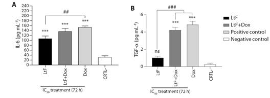 Fig. 3 Pro-inflammatory cytokines produced by MTSs. A. IL-6, B. TNF-α. MTSs were incubated alone or in combination with LtF or LtF+Dox. LtF IC50 = 428 µg/ml, Dox IC50 = 2 µg/ml. Significance obtain by one-way ANOVA is indicated as ***P < 0.001, and Tukey’s post-test significance is indicated as ###P < 0.001, ##P < 0.01; ns, statistically non-significant difference using one-way ANOVA. Data are expressed as mean ± SEM (N = 6).