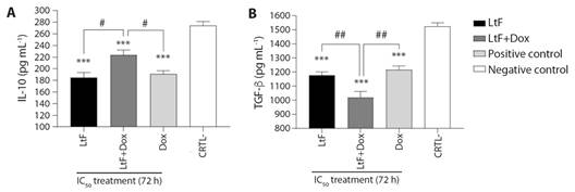 Overexpression of IL-10 is a poor prognostic indicator associated with drug resistance, metastatic cancer, and a high probability of recurrence (Li et al., 2014). The decrease of this cytokine observed in supernatants of MTSs as a result of the treatments applied is significant compared to the untreated. A better decrease was observed with LtF and Dox than with LtF+Dox, highlighting the immunomodulatory capacity of LtF in the system used. Increased production of this cytokine in LtF+Dox may be beneficial in the treatment of advanced stage BC, as it would attenuate the Dox-induced inflammatory state.