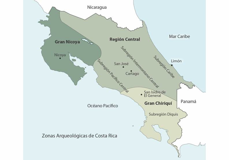 Fig. 1 Mapa de zonas arqueológicas de Costa Rica, basado en Murillo-Herrera (2011). Adaptado por Natalia Rodríguez; ilustración por Natalia Rodríguez. / Fig. 1. Map of archaeological sites in Costa Rica, based on Murillo-Herrera (2011). Adapted by Natalia Rodríguez; illustration by Natalia Rodríguez.