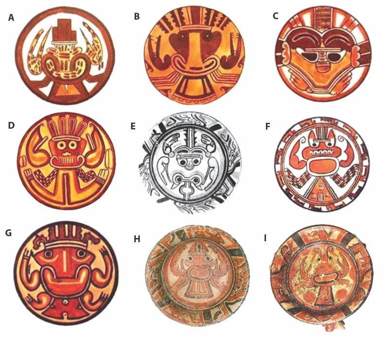 La configuración rostro - caparazón también fue utilizada por los ceramistas de la cultura Moche, en la costa norte del Perú (Fig. 7a, Fig. 7b, Fig. 7c, Fig. 7e, Fig. 7f). Generalmente representan cangrejas adultas, por la forma del abdomen. Algunas tienen como idealización más apéndices que los propios del cangrejo (Fig. 7b, Fig. 7c, Fig. 7g); algunas son antrozoomorfas: con pies humanos mostrando el empeine y/o cabezas antropomorfas ubicadas donde se encuentra la boca en los cangrejos (Fig. 7 a, Fig. 7b, Fig. 7c, Fig. 7e). Es probable que algunas sean representaciones de especies del género Callinectes sp. (jaibas), considerando que representaron una forma similar de caparazón (Fig. 7a, Fig. 7b, Fig. 7c, Fig. 7d, Fig. 7h).