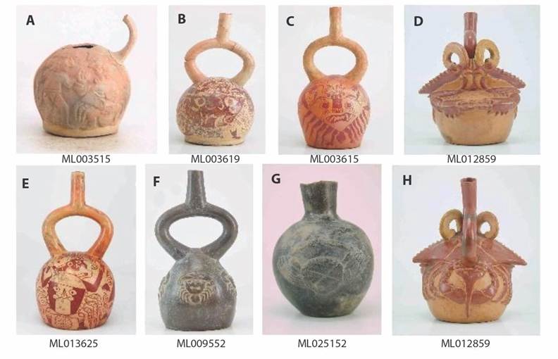 Fig. 7 Botellas de la cultura moche, Perú, con representación de cangrejos. Colección y fotografías cortesía del Museo Larco, Lima - Perú. g - presenta un gráfico de bandas cruzadas sobre el caparazón. h - enseña una vista posterior del artefacto de la Fig. 7 d, que representa un cangrejo Callinectes hembra con abdomen de un macho agregado; presenta antenas idealizadas. Código de registro de pieza al pie de cada imagen. / Fig. 7. Bottles from the Moche culture, Peru, depicting crabs. Collection and photographs courtesy of the Larco Museum, Lima - Peru. g - shows a graphic of crossed bands on the carapace. h - shows a posterior view of the piece of Fig. 7 d, representing a female Callinectes crab with the abdomen of a male added; it has idealized antennae. Piece registration code at the bottom of each image.