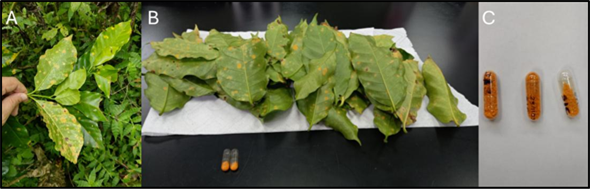 Figura 1 Recolección de hojas con roya en campo (A), raspado del inóculo (B) y almacenaje en cápsulas en laboratorio (C). Figure 1. Collection of coffee leaves with rust in the field (A), scraping of inoculum (B), and storage in capsules in the laboratory (C).