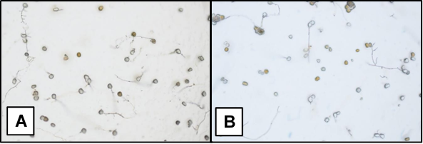 Las uredosporas recolectadas de las pústulas presentaban una coloración naranja intensa y un tamaño homogéneo. Para evitar la disminución en la tasa de germinación debido a la recolección de uredosporas envejecidas producidas por el fitopatógeno en condiciones naturales, se excluyeron aquellas pústulas que mostraban parasitismo por agentes de control biológico natural.