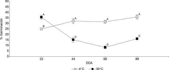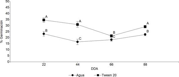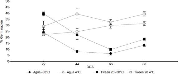 En ambos tratamientos (Figura 5) se identificó una disminución inicial en el porcentaje de germinación, seguida de un aumento, donde este último fue a los 66 DDA para Tween 20 y a los 44 DDA para agua desionizada.