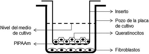 Para los ensayos de cultivo sobre un soporte artificial termosensible (UpCell, Japón) se emplearon placas multipozo, sobre las cuales se colocaron insertos que contenían en su base el polímero PIPAAm (figura 1). Sobre esta superficie se sembraron queratinocitos provenientes tanto de aislamientos primarios como de subcultivos. En la superficie de la placa multipozo (la cual no tiene contacto físico con el inserto), se sembró una capa alimentadora constituida por fibroblastos humanos; en algunas muestras no se hizo el cocultivo y se emplearon como control. Las condiciones de cultivo fueron las mismas que las aplicadas para el establecimiento de los cultivos primarios y subcultivos de queratinocitos y fibroblastos.
