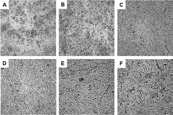 Se muestran las células a los 6 (A), 9 (B), 12 (C), 15 (D), 18 (E) y 21 (F) días de incubación. Nótese la morfología poligonal típica de las células epiteliales, así como la formación de un epitelio estratificado a partir del día 12.