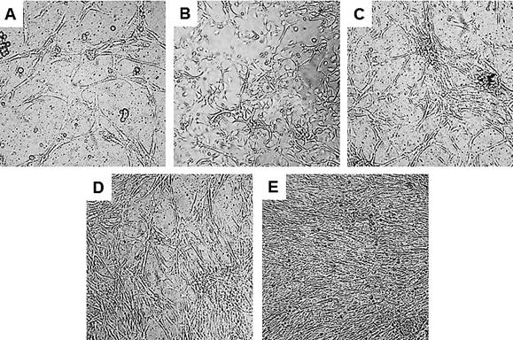 Figura 3 Cultivo de queratinocitos sin capa alimentadora sobre un soporte artificial termosensible (PIPAAm). Se muestran las células a los 3 (A), 6 (B), 9 (C), 12 (D) y 15 (E) días de incubación. Se observa una predominancia de células de morfología alargada y estrellada tipo fibroblastoide.