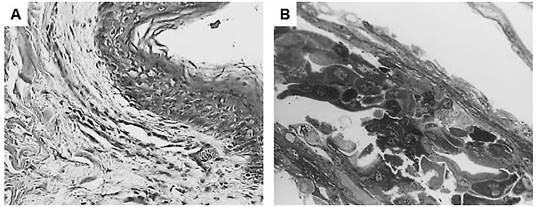 Figura 4 Tinción con hematoxilina-eosina de una muestra de piel normal (A, 400x) y una muestra de epitelio cultivado sobre el soporte artificial termosensible (PIPAAm) (B, 800x).